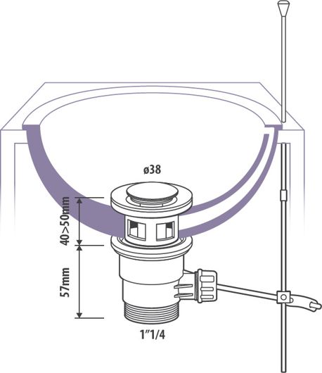 Выпуск размером 63х107 мм (ШхВ) представляет собой донный клапан с доводящим кольцом, посредством которого монтажная высота регулируется в пределах 97-107 мм. Диаметр клапана составляет 38 мм. В корпусе изделия выполнен резьбовой патрубок диаметром 2,44 мм. Управляется донный клапан рычагом с шаровидным уплотнителем.