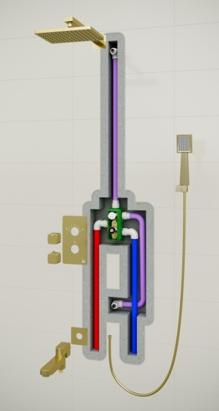 Душевая система с термостатом Timo Petruma 5049 относится к премиальному сегменту, предназначена для монтажа в полой или твердой стене. Термостатический картридж поддерживает стабильную температуру воды, обеспечивая максимально комфортные условия для принятия водных процедур. Использовать такой смеситель очень удобно, регулировка температуры воды осуществляется ручкой термостата (расположена по центру). Включение режима "тропический душ" и увеличение напора осуществляется поворотом ручки дивертора (расположена сверху) влево. Для переключения в режим "ручной душ" верните ручку дивертора в исходное положение 12:00 (смеситель выключен), а затем поверните вправо. Увеличение напора воды осуществляется поворотом ручки вправо. Для включения режима "излив" поверните ручку дивертора (расположена снизу) с положения 12:00 (излив выключен) влево. Увеличение напора воды осуществляется поворотом ручки влево. Смеситель может работать в двух режимах одновременно "тропический душ"+"излив" или "тропический душ"+"ручной душ".