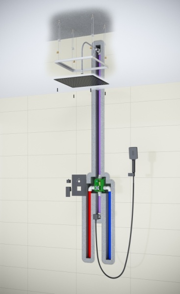 Встраиваемая душевая система Selene 2029, относится к премиальному сегменту, предназначена для монтажа в полой или твердой стене. Встроенный потолочный душ большого размера создает имитацию проливного дождя, вода обливает человека целиком. Использовать такой смеситель очень удобно, регулировка напора и температуры воды осуществляется одним рычагом. Переключение режимов "тропический душ" и "ручной душ" осуществляется поворотом ручки дивертора.