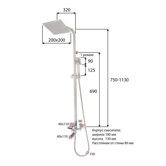 Душевая система однорычажный (хром), излив литой 125 мм, квадратная лейка