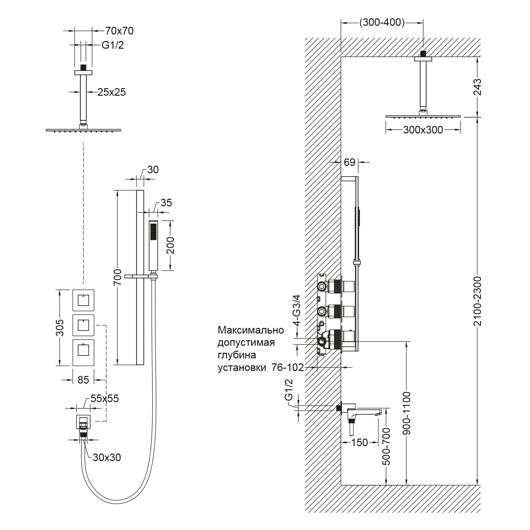 Термостатический картридж поддерживает стабильную температуру воды, обеспечивая максимально комфортные условия для принятия водных процедур. Настенный душ с двумя режимами позволяет принимать водные процедуры в зависимости от настроения. Регулируя напор воды можно получить массажное воздействие различной интенсивности.