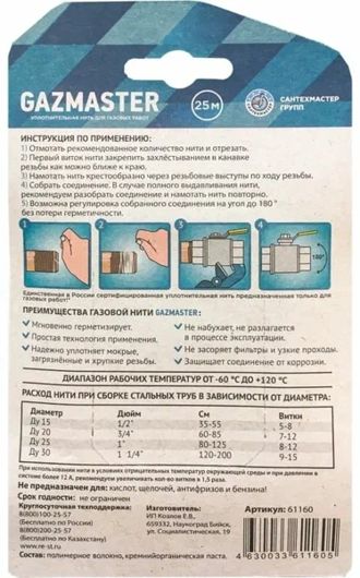 Уплотнительная нить GAZMASTER предназначена для герметизации и защиты от коррозии металлических, пластиковых труб и фитингов.