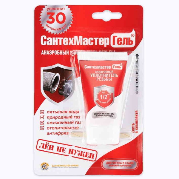 Сантехмастер Гель Красный для чугуна и стали 15 г – это анаэробный герметик для резьбовых соединений из черного металла. Этот гель отлично подходит для сверхпрочной фиксации и герметизации резьбы и фитингов в трубопроводах, собранных с использованием черных металлов. Применяется для соединений диаметром до 3".