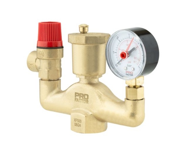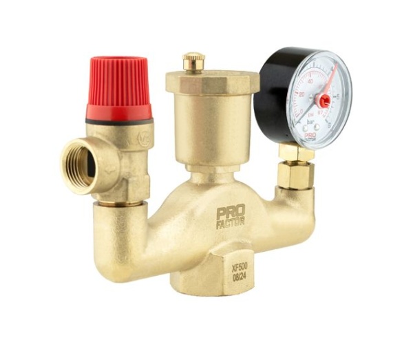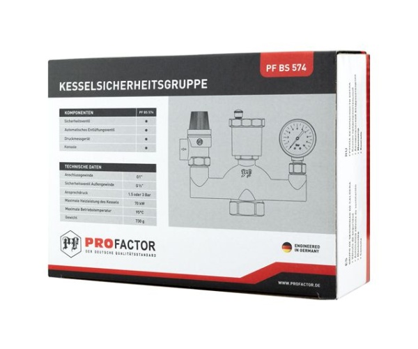 Группа безопасности котла PROFACTOR® PF BS 574 предназначена для защиты автономных систем отопления от превышения максимально допустимого рабочего давления, а также для отвода воздуха и контроля давления в этих системах.