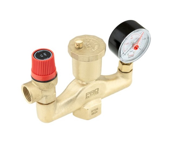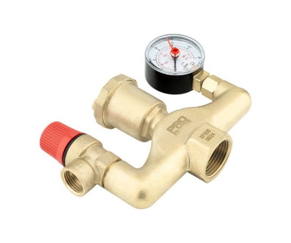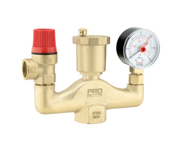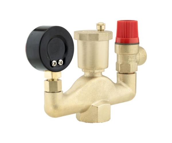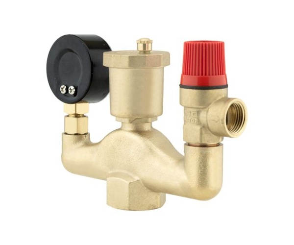 Состоит из латунного корпуса, предохранительного клапана, автоматического воздухоотводчика и манометра.