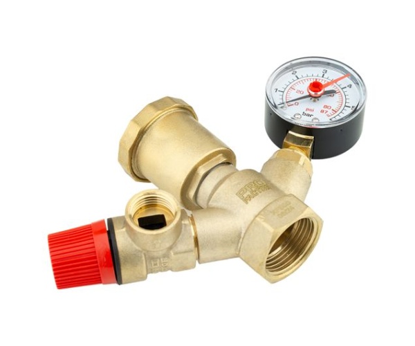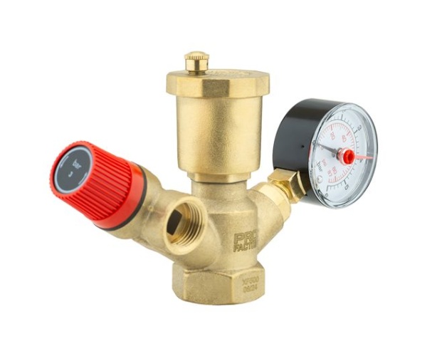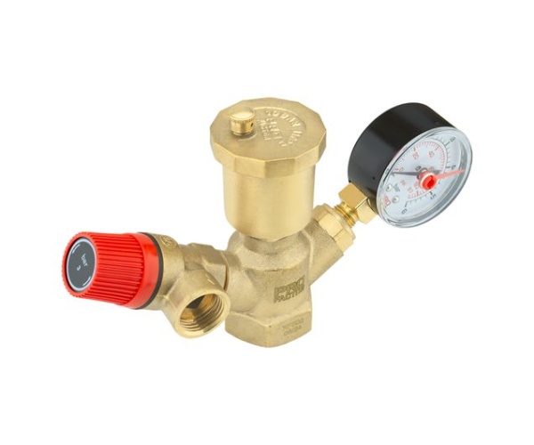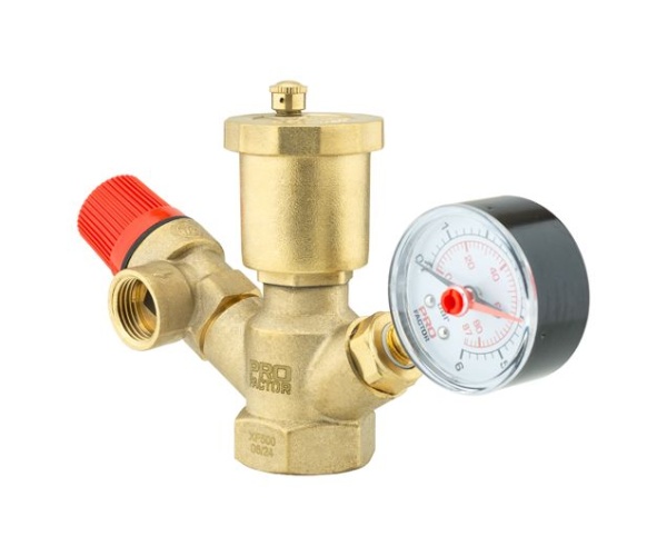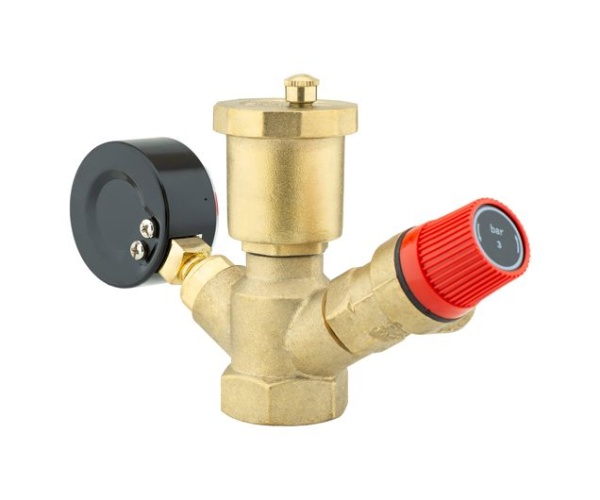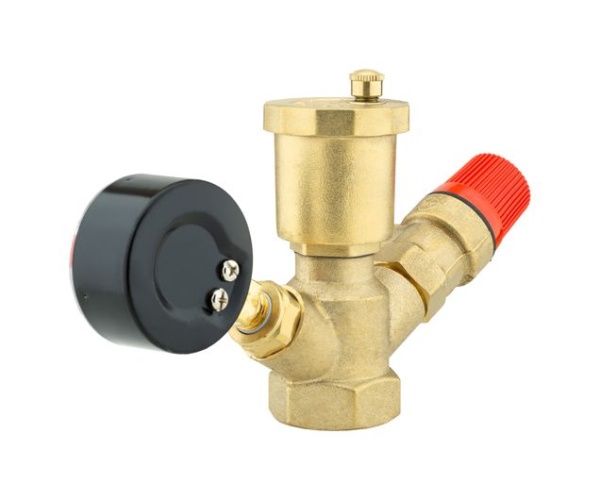 Состоит из латунного корпуса, предохранительного клапана, автоматического воздухоотводчика и манометра.