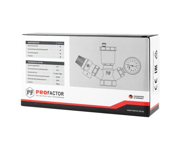 Группа безопасности котла PROFACTOR® PF BS 573 предназначена для защиты автономных систем отопления от превышения максимально допустимого рабочего давления, а также для отвода воздуха и контроля давления в этих системах.