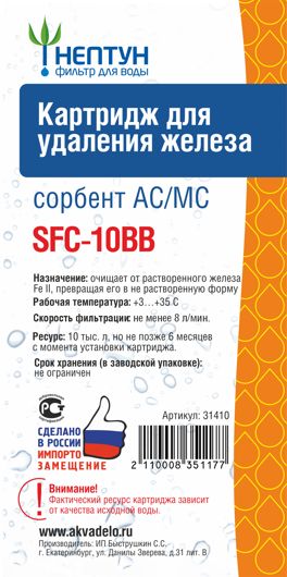 Для картриджа Нептун SFC-10SL используют смесь сорбентов АС/МС, которую следует перезагружать каждые полгода, чтобы продлить срок эксплуатации. Устанавливается в колбу (магистральный фильтр) длиной 10" (10sl)