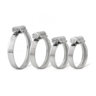 Хомуты обжимные червячного типа выпускаются с шириной ленты 9 мм, головка винта под крестовидную отвертку и ключ 7 мм, зажимаемые диаметры от 10 мм до 160 мм. Хомут выпускается из нержавеющей стали различных классов и отличается хорошей стабильностью характеристик.