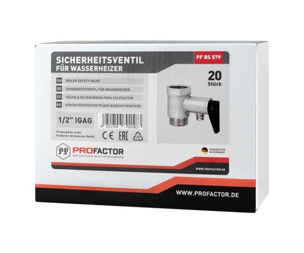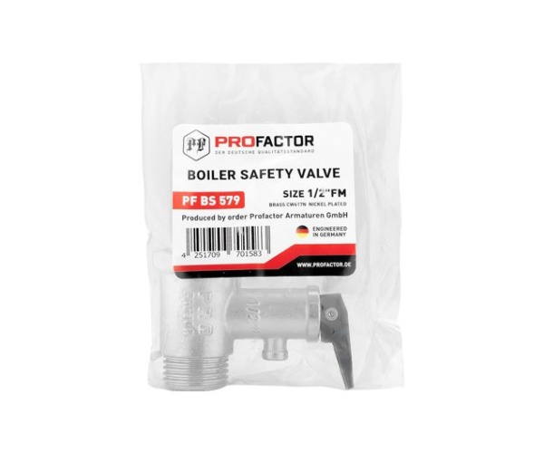Клапан предохранительный для водонагревателя с ручкой сброса PROFACTOR® PF BS 579 предназначен для защиты водонагревательных систем от превышения максимально допустимого рабочего давления, а также для предотвращения вытекания нагретой воды обратно в подающий трубопровод, что может возникать при малом давлении в нем или отсутствии подачи воды.