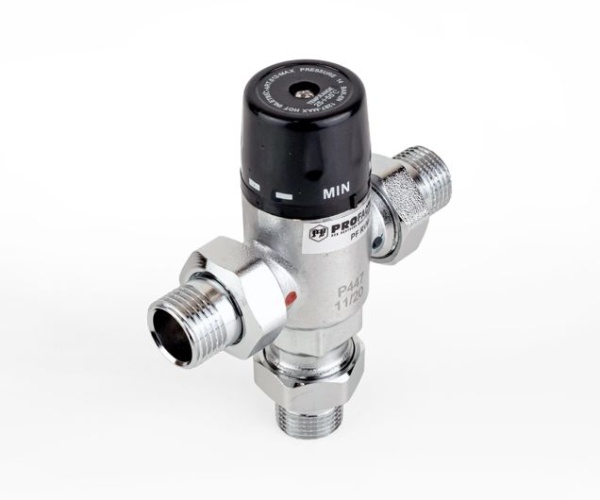 Термостатический смесительный клапан PROFACTOR® PF RVM 395 предназначен для автоматического поддержания заданной температуры воды в системах горячего водоснабжения. Он позволяет моментально смешивать входящие жидкости (горячую и холодную воду) и обеспечивает стабильную температуру смешанной воды на выходе, независимо от изменения давления и температуры жидкостей на входе смесителя, не является запорным.