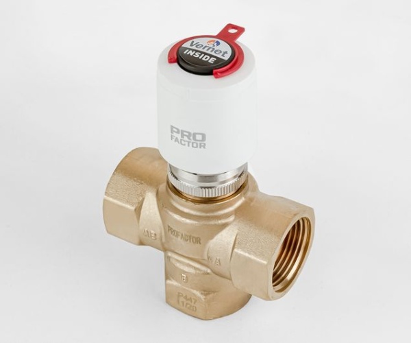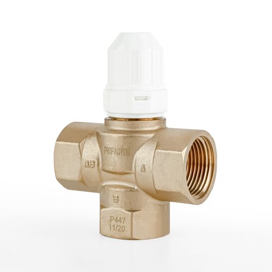 Трёхходовой смесительный клапан PF RVM 396 предназначен для эксплуатации в смесительных узлах водяных гидравлических систем. Используется для поддержания установленного уровня температуры смешанной жидкости. Регулирование клапаном может осуществляться: вручную с помощью защитно-регулировочного колпачка, посредством термоголовки или термоэлектрическим приводом, работающим под управлением контроллера или комнатного термостата. В качестве рабочей жидкости может выступать вода или растворы пропиленгликоля и этиленгликоля с концентрацией не более 40%.