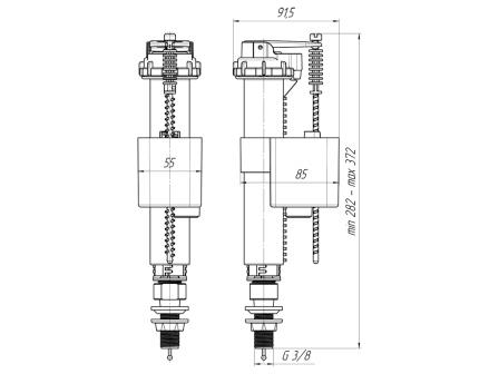 Наливной механизм бачка унитаза с боковой подводкой и латунной резьбой диаметром 3/8