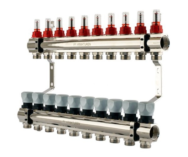 Контуры системы отопления или теплого пола подключаются к коллектору, что позволяет осуществлять регулировку и контроль потока теплоносителя индивидуально в каждом циркуляционном контуре.