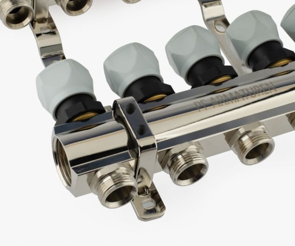 Контуры системы отопления или теплого пола подключаются к коллектору, что позволяет осуществлять регулировку и контроль потока теплоносителя индивидуально в каждом циркуляционном контуре.
