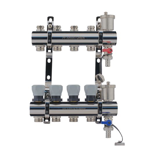 Коллекторная группа PROFACTOR® PF MB 804 используется в системах водоснабжения, радиаторного или напольного отопления для распределения и регулирования рабочей среды в системе.