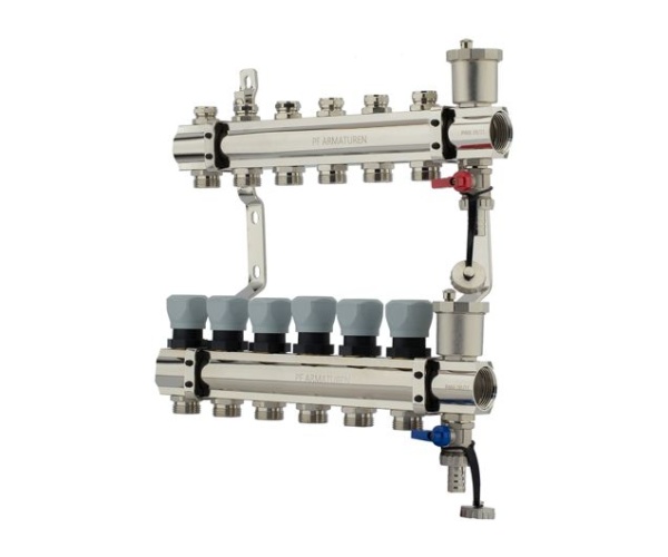 Контуры системы отопления или теплого пола подключаются к коллектору, что позволяет осуществлять регулировку и контроль потока теплоносителя индивидуально в каждом циркуляционном контуре.