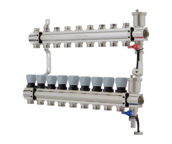 Контуры системы отопления или теплого пола подключаются к коллектору, что позволяет осуществлять регулировку и контроль потока теплоносителя индивидуально в каждом циркуляционном контуре.