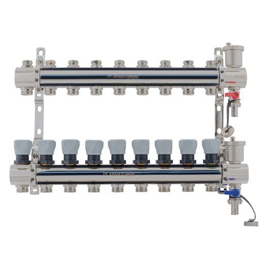 Коллекторная группа PROFACTOR® PF MB 804 используется в системах водоснабжения, радиаторного или напольного отопления для распределения и регулирования рабочей среды в системе.