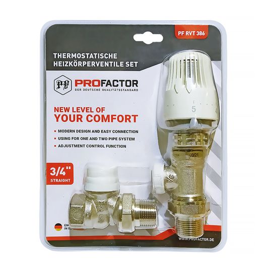 Комплект радиатора термостатический PROFACTOR предназначен для подключения отопительных приборов и плавного регулирования теплового режима в помещении за счет изменения расхода теплоносителя в отопительных системах, может использоваться в однотрубных и двухтрубных системах отопления. Применение термостатический комплекта позволяет уменьшить потребление тепловой энергии.