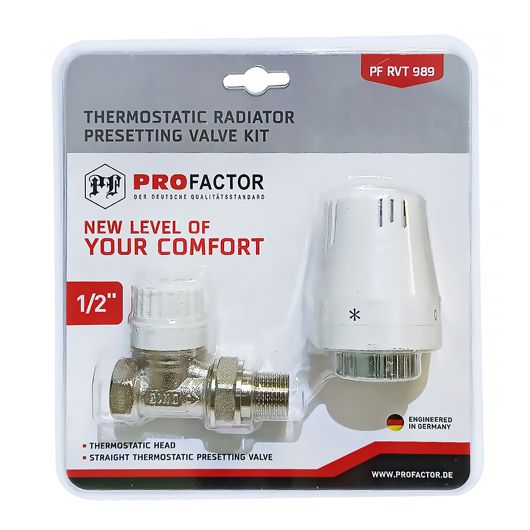 Комплект радиатора термостатический PROFACTOR предназначен для подключения отопительных приборов и плавного регулирования теплового режима в помещении за счет изменения расхода теплоносителя в отопительных системах, может использоваться в однотрубных и двухтрубных системах отопления. Применение термостатический комплекта позволяет уменьшить потребление тепловой энергии.