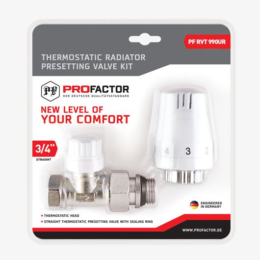 Комплект радиатора термостатический PROFACTOR предназначен для подключения отопительных приборов и плавного регулирования теплового режима в помещении за счет изменения расхода теплоносителя в отопительных системах, может использоваться в однотрубных и двухтрубных системах отопления. Применение термостатический комплекта позволяет уменьшить потребление тепловой энергии.