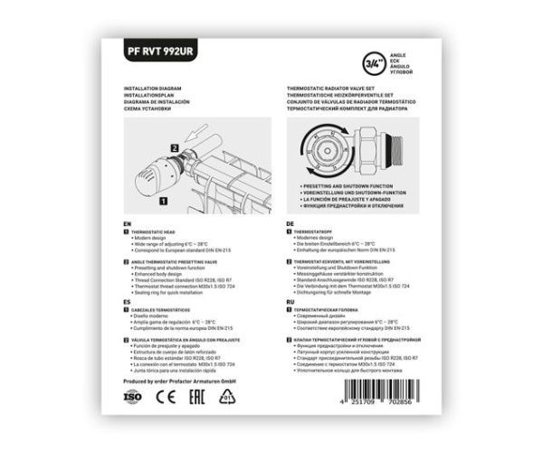 – клапан термостатический угловой с преднастройкой PF RVT 983UR;
