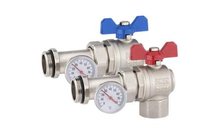 Кран коллекторный. Применяется для подключения коллекторных корпусов к подающему и обратному трубопроводам систем отопления. Имеют комбинированную конструкцию с аксиальным термометром со шкалой от 0 до 80° С для экономии строительной длинны. Основные узлы и детали унифицированы со стандартными шаровыми кранами полного прохода типа EU.ST1287, EU.ST1288. Учитывая размерность шкалы термометра целесообразно применять для низкотемпературных индивидуальных систем отопления. При подключении не требуют дополнительных уплотнений со стороны коллектора. Рукоятки окрашены в красный и синий цвета для маркировки подающего и обратного трубопроводов.