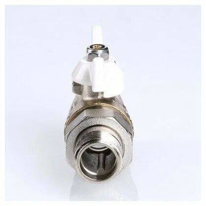 Прямой полнопроходной ремонтопригодный шаровой кран с увеличенным ресурсом. Соединен накидной гайкой с резьбовым полусгоном. Корпуса деталей – латунные, никелированные. Кран оснащен ручкой типа «бабочка» с утолщенной стенкой из алюминиевого сплава и эпоксидной покраской. Резьба присоединений – внутренняя/наружная.