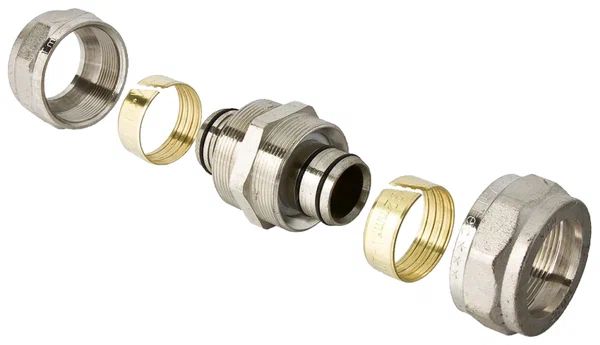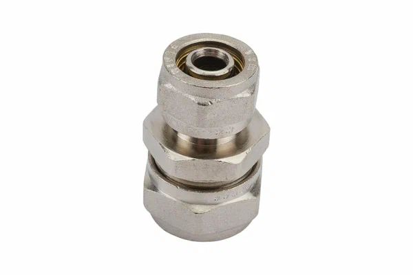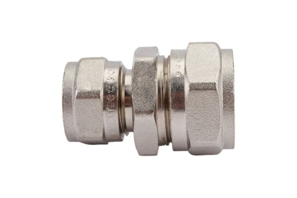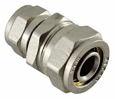Двухсторонний прямой латунный фитинг с никелированным покрытием, предназначенный для соединения металлополимерных труб.