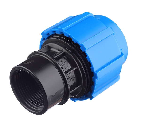 Муфта компрессионная с внутренней трубной резьбой. Предназначена для возможности легкого перехода со стального трубопровода на трубопровод из ПНД труб, так как имеет резьбу соответствующую размерам и стандартам стальных трубных резьб. Кроме этого, муфта компрессионная с внутренней резьбой может учувствовать в строительстве различных комбинаций отводов и разветвлений с применением других компрессионных ПНД фитингов.