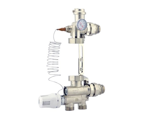 Насосно-смесительный узел используется для понижения температуры теплоносителя на входе в контур теплого пола, т.к. температура теплоносителя для радиаторов (75°С – 95°С) гораздо выше допустимой температуры для водяного теплого пола (35°С – 55°С).