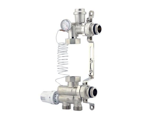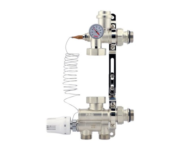 Насосно-смесительный узел (НСУ) представляет собой готовый комплект арматуры в сборе (без насоса), предназначенный для принудительной циркуляции, регулировки и поддержания заданной температуры теплоносителя в системах водяных теплых полов.
