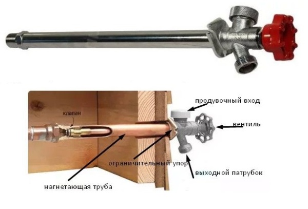 Кран предназначен для круглогодичного использования, в том числе и при отрицательных температурах окружающей среды. Кран для стен 250мм стены из кирпича, стены из керамических или пеноблоков. Запорная часть крана находится в пределах отапливаемого помещения, вентиль и излив — на улице, с внешней стороны здания. Монтаж крана производится с небольшим уклоном в сторону улицы. Остатки воды из наклонного носика вытекают сразу же после прекращения подачи воды под напором, в результате чего исчезает опасность возникновения ледяных пробок, способных препятствовать стоку воды.