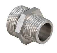 Латунный никелированный фитинг с переходом на другой диаметр резьбового соединения. Резьба – наружная/наружная, цилиндрическая трубная. Предусмотрен участок корпуса шестигранной формы, под гаечный ключ.