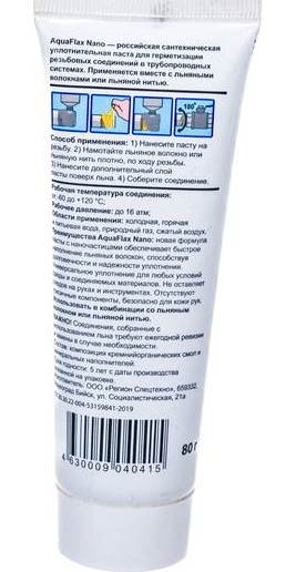 Специально разработанная формула пасты AQUAFLAX NANO имеет наночастицы, которые позволяют быстро и эффективно проникать в структуру льна и надежно уплотнять резьбу. Ее формула не пачкает инструмент и руки мастера и легко стирается без использования воды.