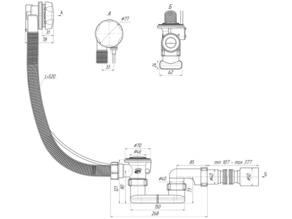 Максимальная длина гофрированной трубы перелива 520 мм. Пробка обвязки для ванны из нержавеющей стали диаметром 43 мм. Обвязка изготовлена из пропилена, сифон плоский с жесткой трубой.