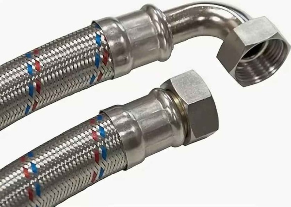 Угловая подводка предназначена для подвода горячей или холодной воды, в том числе и питьевой к сантехприборам: душевые кабины, водонагреватели, насосные станции водоснабжения, доводчики высокого давления, водяные баки, стиральные машины и т.п. На концах шланга расположены две гайки с внутренней резьбой.