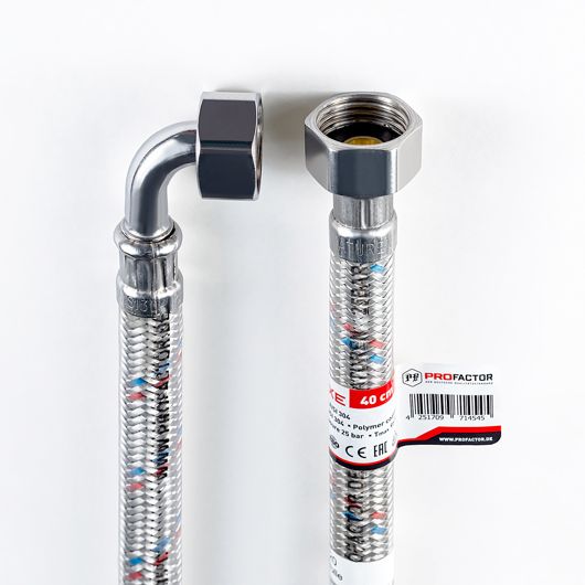 Гибкая подводка угловая PROFACTOR® LUXE применяется для присоединения сантехнической арматуры и приборов сантехнического назначения (кранов, унитазов, душевых кабин) и подведения воды к агрегатам бытового назначения (водонагревательным приборам, стиральным и посудомоечным машинам, и т.д.).