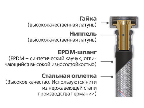 При всей своей кажущейся простоте гибкая подводка для воды- довольно сложный технический элемент, который требует применения современных технологий и использования качественных материалов. В конструкции гибкой подводки для воды применяется шланг из нетоксичной резины марки EPDM. Данная резина имеет большой срок службы и широкий диапазон рабочих температур, что позволяет использовать её для транспортировки, как с холодной, так и с горячей водой, о чём свидетельствуют вплетенные в оплетку гибкого соединения синяя и красная нити.