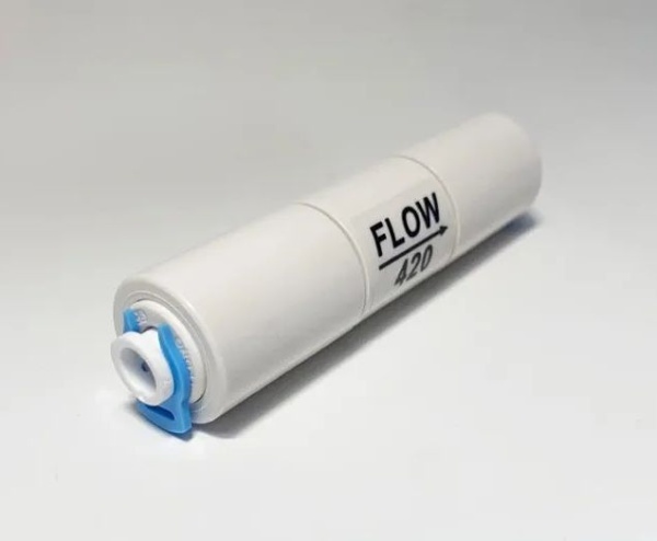 Ограничитель потока воды (редукционный клапан для сливной магистрали) 1/4" (420 мл/мин) предназначен для ограничения потока воды, поступающего в канализацию после промывки каналов обратноосмотической мембраны.