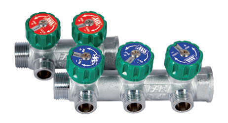 Комплектация: Тело коллектора, встроенные кран-буксы, температурные бирки(красная, синяя), бирка-указатель, колпачки кранбукс, болты.