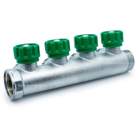 Коллектор TIM регулирующий 1" x 3/4" на 4 выхода (зеленые ручки) применяется для распределения потока жидкостей в системах холодного и горячего водоснабжения, напольном и радиаторном отоплении.