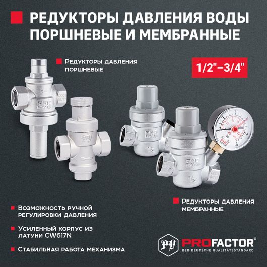 Редуктор давления поршневой PROFACTOR® предназначен для понижения и стабилизации давления в системах бытового и промышленного водоснабжения. Редуктор поддерживает заданное давление на выходе (с возможностью регулировки) в динамическом и статическом режимах независимо от изменения давления на входе. Установка данного изделия позволяет избежать повреждений, вызываемых избыточным давлением и гидроударами, а также уменьшить расход воды.