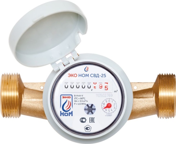 Счетчик воды ЭКО НОМ-СВД-25+КМЧ (одноструйный) Универсальный (с комплектом монтажных частей) Износостойкая пластмасса; Вал - нержавеющая сталь; Подшипник скольжения; Cтальной опорный стержень из нержавеющей стали; Латунный корпус; Поворот счетного механизма на 360°; Встроенная двойная антимагнитная защита; Встроенный фильтр; Многоступенчатая система контроля качества; Cоответствие СанПиН 2.1.4.1074-0