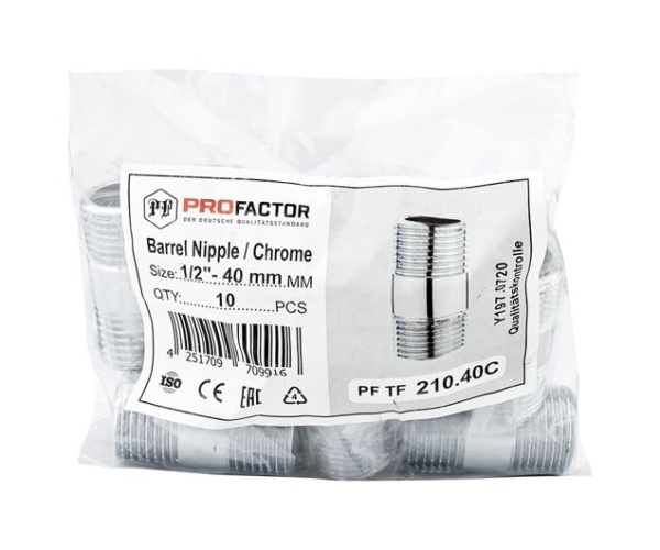 Фитинги резьбовые латунные хромированные PROFACTOR® предназначены для создания разъёмных соединений (в том числе быстроразъемных) при монтаже трубопроводных систем всех типов (систем водоснабжения, отопления, сжатого воздуха и др.).