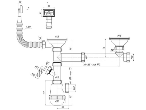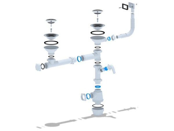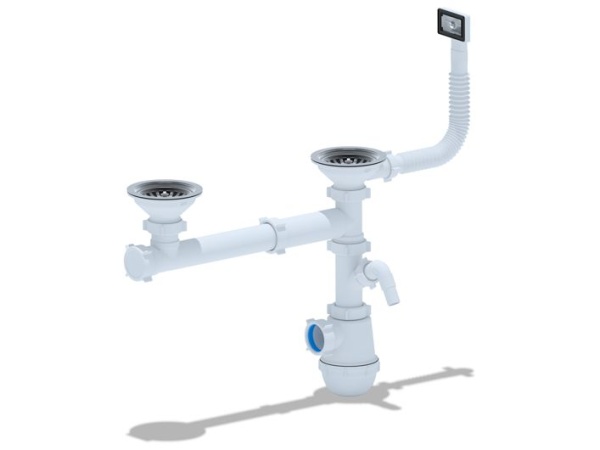 Сифон для кухонной мойки с двумя чашами и сливными отверстиями 90 мм. Выход для подключения к канализации 40 мм