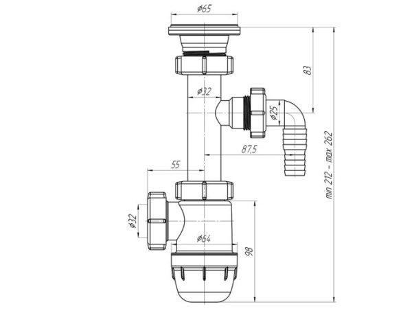 Сифон для умывания бутылочного типа с уменьшенным корпусом, с отводом для подключения бытовой техники.