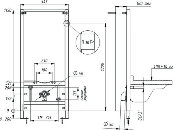 · Размеры инсталляции (В х Ш х Г) мм. - 1150–1350 (регулируемая) х 545 х 180