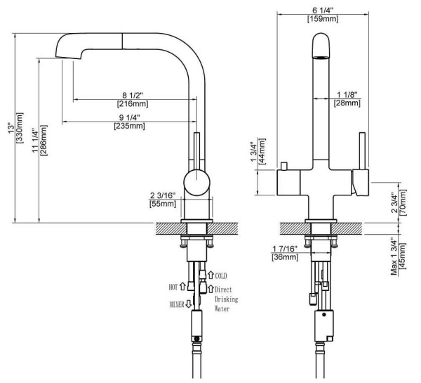 Смеситель Timo Saona 2346 с выдвижной лейкой и системой подключения фильтрованной воды относится к премиальному сегменту, предназначен для монтажа на кухонную мойку или столешницу. Высокий излив подходит для моек с двумя чашами, а также позволяет справляться с мытьем габаритной посуды. Выдвижная лейка с прочным шлангом облегчает мытье раковины, крупной посуды, позволяет набрать воду в емкость, стоящую рядом с мойкой. Встроенный магнитный держать позволяет легко вернуть лейку в исходное положение. В нижней части смесителя установлена трубка с адаптером для соединения с трубкой фильтра. Подача фильтрованной воды осуществляется поворотом ручки дивертора расположенной слева на корпусе смесителя.